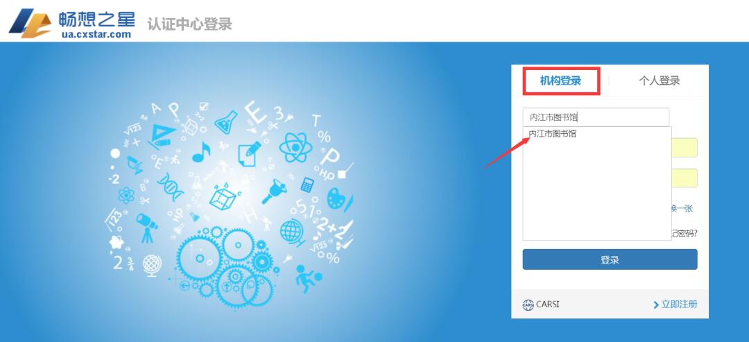 3.點(diǎn)擊“機(jī)構(gòu)登錄”,下拉菜單選擇“內(nèi)江市圖書館”