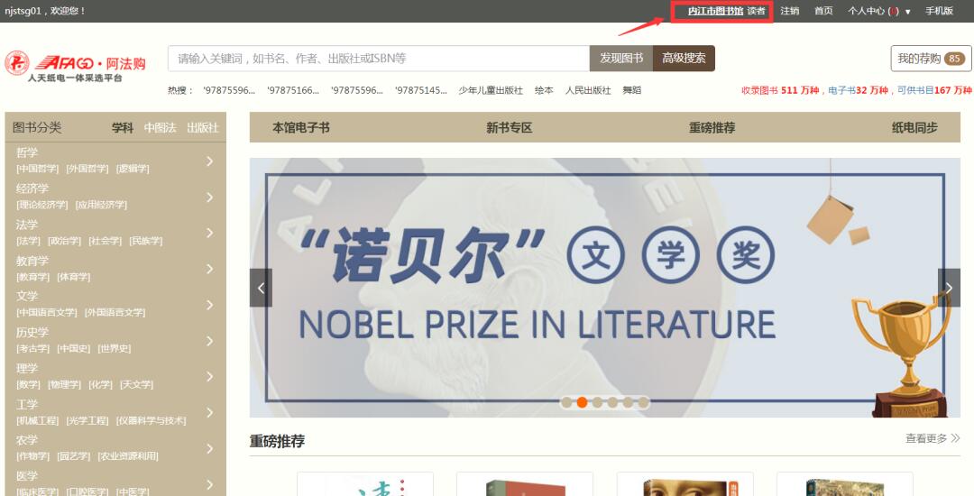5.進(jìn)入平臺,顯示“內(nèi)江市圖書館”讀者即登錄成功