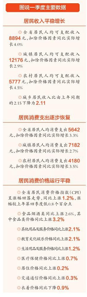 數(shù)據(jù)顯示,一季度全省居民人均消費支出5642元,同比名義增長4.6%,扣除價格因素實際增長3.3%。