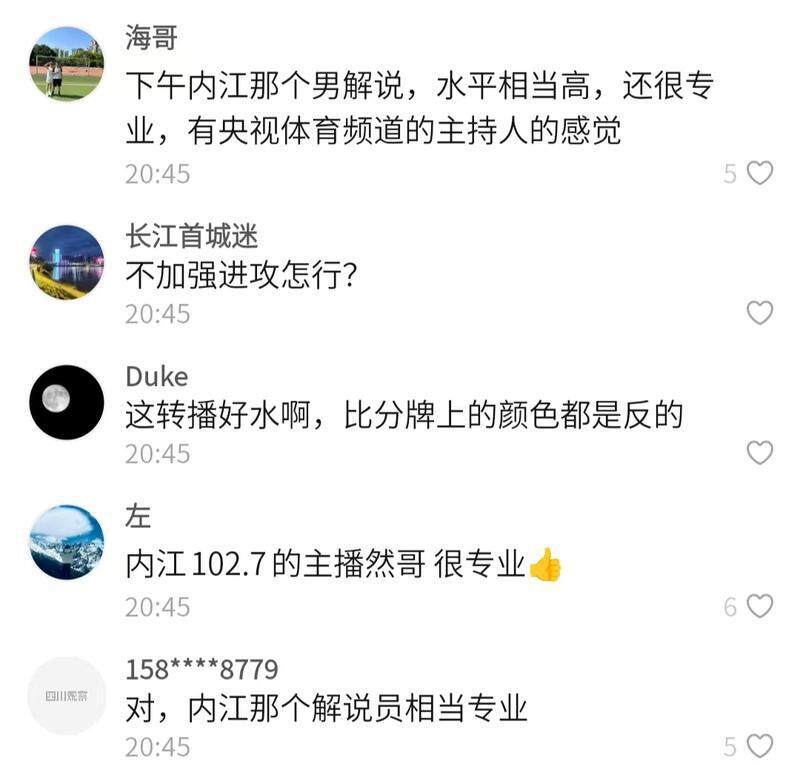 回顧9月27日下午內(nèi)江重龍酒隊(duì)的主場(chǎng)比賽,除了這場(chǎng)酣暢淋漓的勝利外,官方網(wǎng)絡(luò)直播解說(shuō)員也深受廣大球迷好評(píng)。參與這場(chǎng)直播解說(shuō)的是來(lái)自內(nèi)江市融媒體中心的播音員馬然,在本場(chǎng)比賽中他根據(jù)比賽進(jìn)程專業(yè)、公平地進(jìn)行解說(shuō),并回答網(wǎng)友問(wèn)題,得到了網(wǎng)友們的一致認(rèn)可。