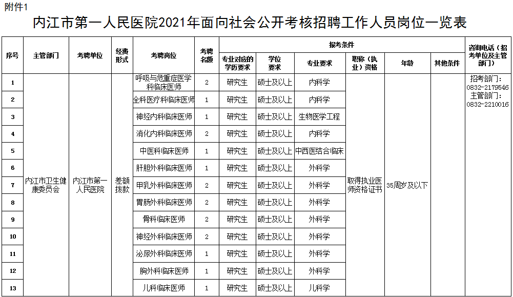 招聘崗位及名額: 34名,具體詳見《內(nèi)江市第一人民醫(yī)院2021年面向社會(huì)公開考核招聘工作人員崗位一覽表》;