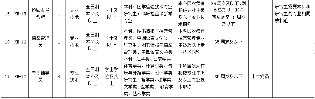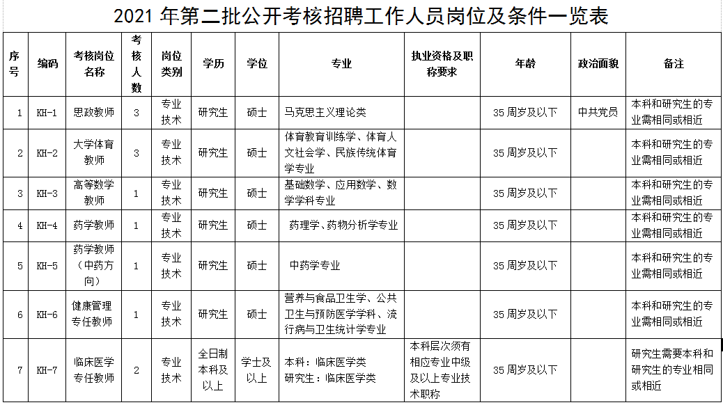 崗位條件:具體要求見《內(nèi)江衛(wèi)生與健康職業(yè)學(xué)院2021年第二批公開考核招聘工作人員崗位和條件一覽表》,凡考聘條件中對(duì)年齡有明確要求的。(對(duì)周歲的計(jì)算方式為:如35周歲及以下,含在報(bào)名首日尚未滿36歲的人員。)