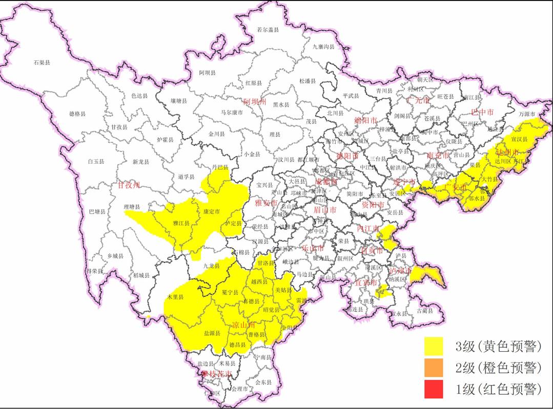 3級(jí)黃色預(yù)警區(qū)域?yàn)檫_(dá)州通川區(qū)、達(dá)川區(qū)、萬(wàn)源市、宣漢縣、開(kāi)江縣、渠縣、大竹縣,廣安廣安區(qū)、前鋒區(qū)、華鎣市、岳池縣、武勝縣、鄰水縣,南充高坪區(qū)、嘉陵區(qū),遂寧船山區(qū)、安居區(qū)、蓬溪縣,內(nèi)江市中區(qū)、東興區(qū)、隆昌市,宜賓江安縣、長(zhǎng)寧縣、興文縣,瀘州合江縣,甘孜州康定市、瀘定縣、丹巴縣、九龍縣、雅江縣、道孚縣、理塘縣,涼山州西昌市、木里縣、鹽源縣、德昌縣、普格縣、布拖縣、金陽(yáng)縣、昭覺(jué)縣、喜德縣、冕寧縣、越西縣、甘洛縣、美姑縣、雷波縣等9市(州)46個(gè)縣(市、區(qū))。