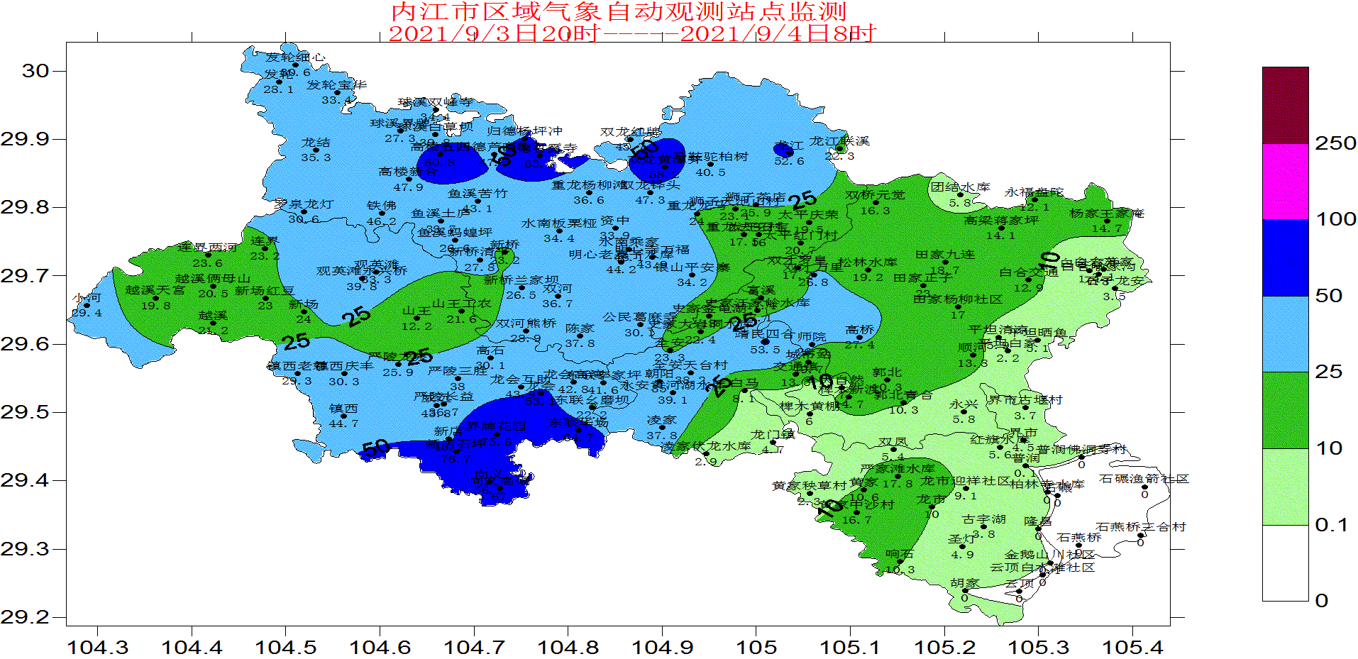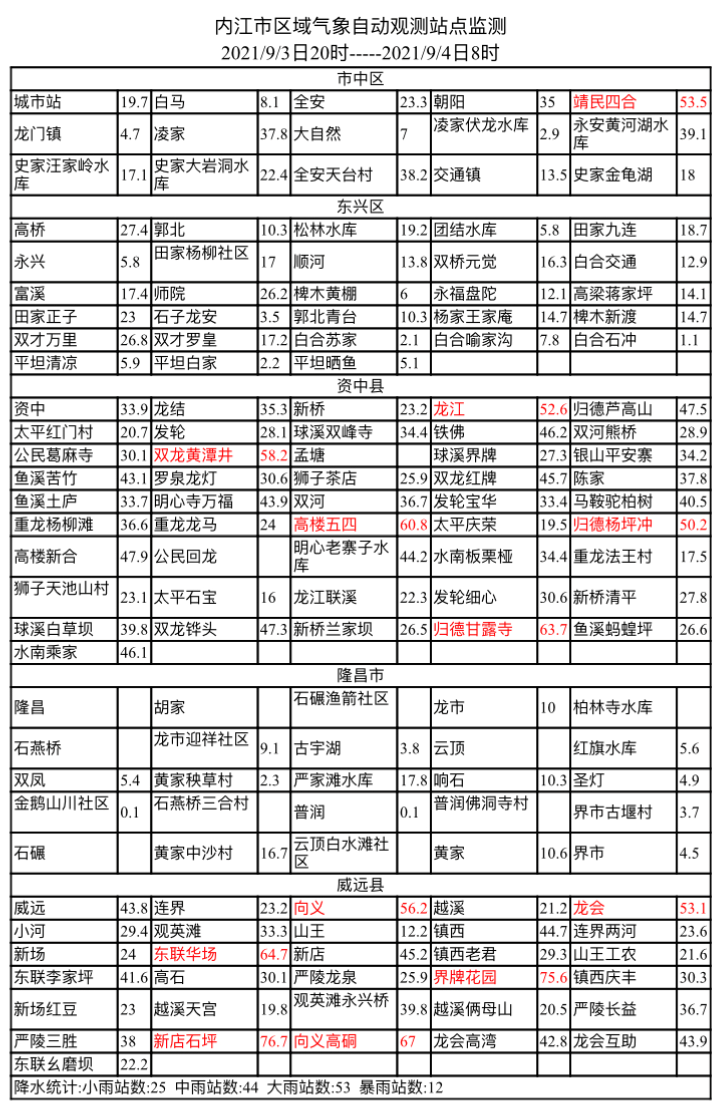 9月3日20時到4日08時,我市出現(xiàn)一次雷陣雨天氣過程,資中縣、威遠縣、市中區(qū)、東興區(qū)普降中雨到大雨,局部地方出現(xiàn)暴雨,隆昌市出現(xiàn)小雨到中雨,并伴有6級陣性風。全市145個監(jiān)測站中,暴雨12站,大雨53站,中雨44站,最大降水出現(xiàn)在威遠縣新店石坪,為76.7毫米。(具體雨量見附表)。