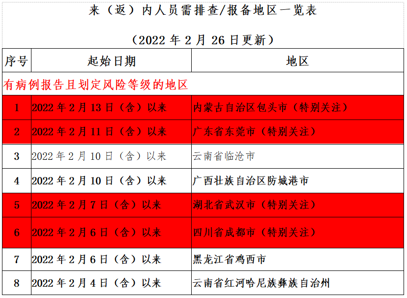 近期重點(diǎn)關(guān)注四川省成都市、德陽市、綿陽市、眉山市,湖北省武漢市,內(nèi)蒙古呼倫貝爾市、呼和浩特市、包頭市疫情。不前往高、中風(fēng)險地區(qū)以及發(fā)生本土疫情的地區(qū)。