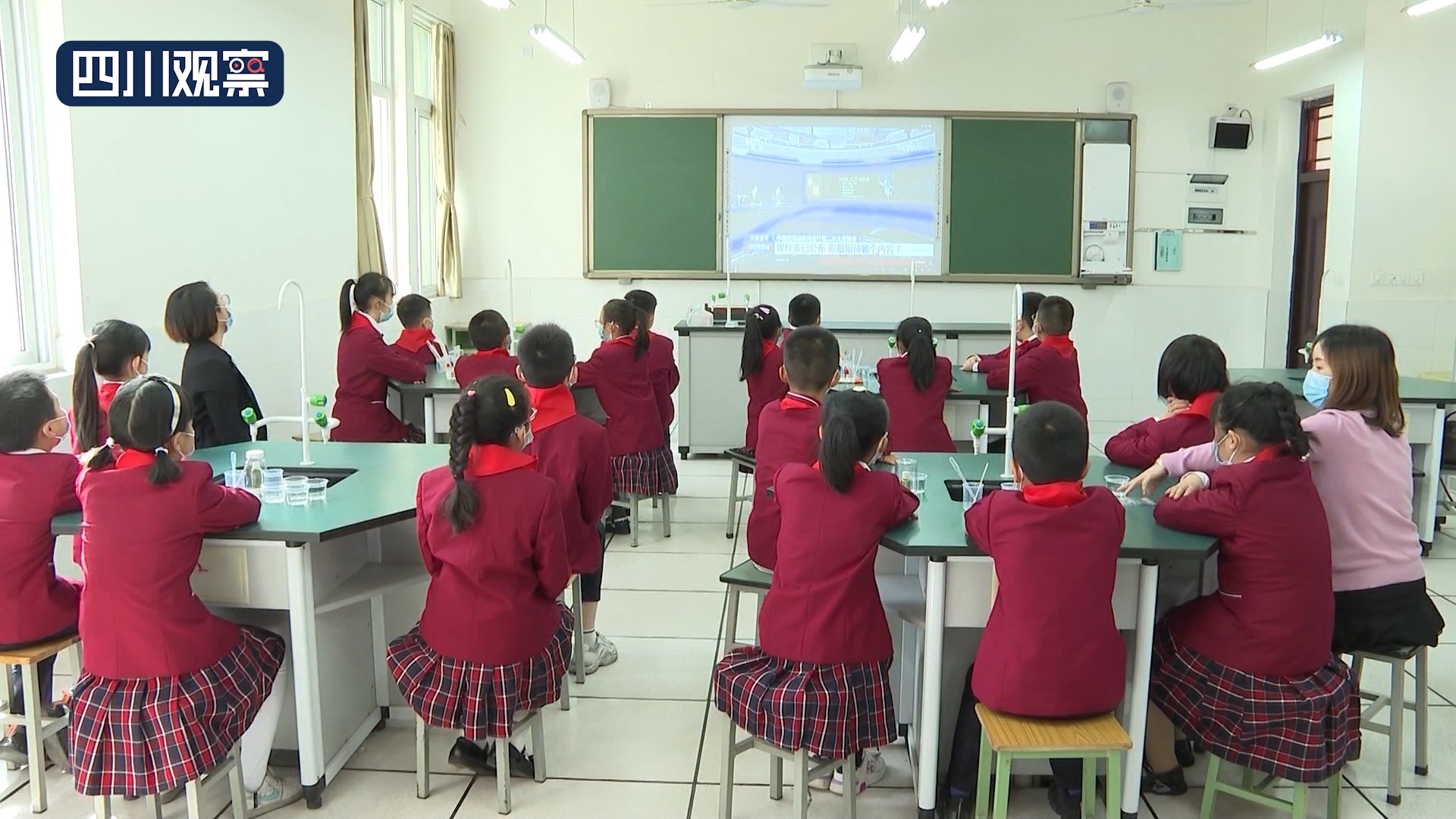 授課期間,天宮課堂——中國流動(dòng)科技館內(nèi)江站內(nèi)江東興區(qū)外國語小學(xué)分場和內(nèi)江市第十小學(xué)的師生們守候在直播屏幕前學(xué)習(xí)觀摩,并進(jìn)行了天地互動(dòng)實(shí)驗(yàn)。