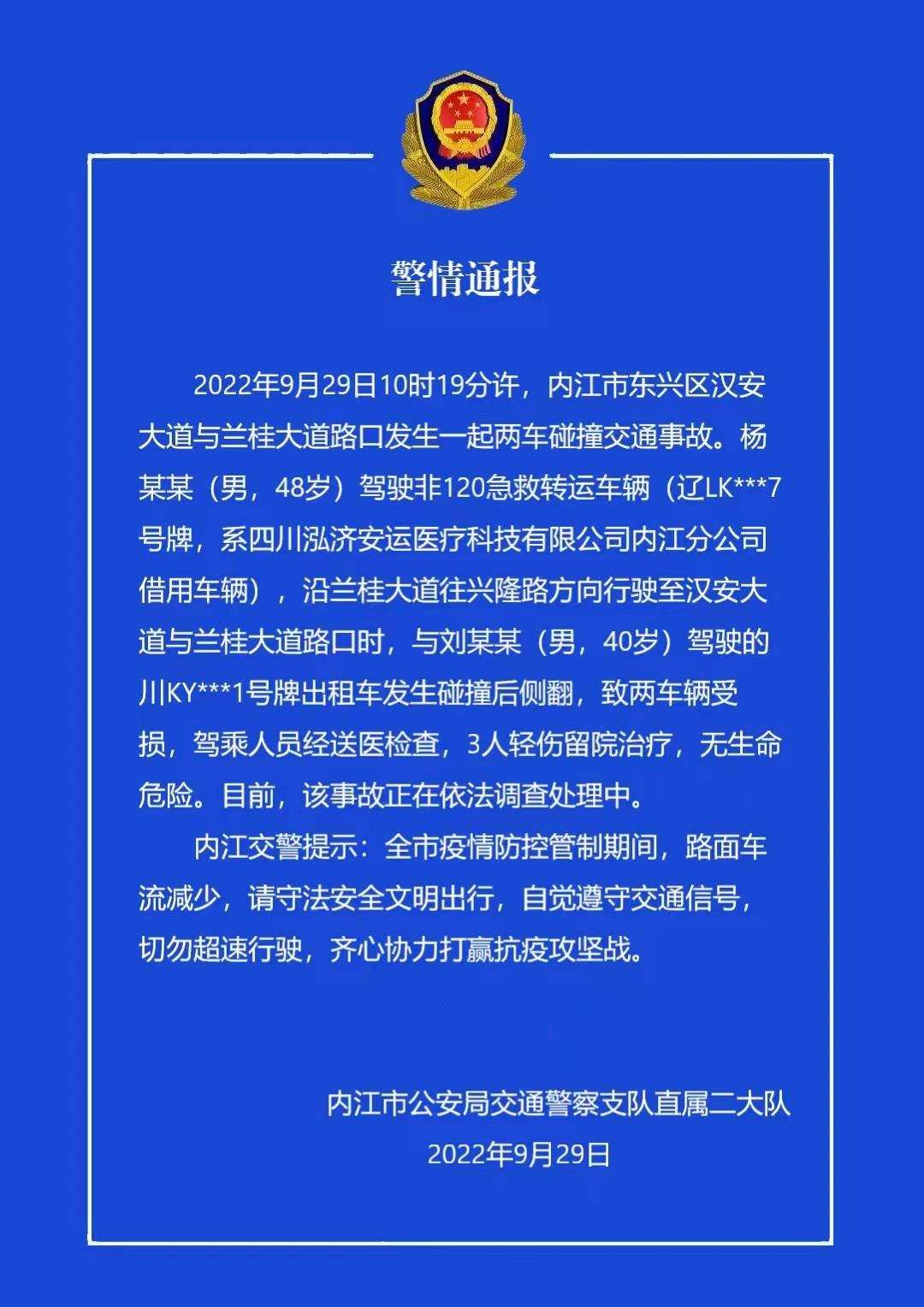 經(jīng)記者向市衛(wèi)健委核實,事故車輛(遼LK***7號牌)不是內(nèi)江市120急救入網(wǎng)車輛,不具120急救轉(zhuǎn)運資質(zhì),該車外部標(biāo)識是否合規(guī),有待進一步調(diào)查。請大家不信謠、不傳謠。