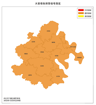 內(nèi)江市氣象臺2022年12月05日09時02分發(fā)布大霧橙色預(yù)警信號:市中區(qū)城西街道、玉溪街道、城東街道、牌樓街道、樂賢街道、史家鎮(zhèn)、全安鎮(zhèn)、朝陽鎮(zhèn)、永安鎮(zhèn)、凌家鎮(zhèn)、龍門鎮(zhèn)、白馬鎮(zhèn)和經(jīng)開區(qū)壕子口街道、交通鎮(zhèn)、靖民鎮(zhèn)等鄉(xiāng)鎮(zhèn)(街道)6小時內(nèi)可能出現(xiàn)能見度小于200米的霧或者已經(jīng)出現(xiàn)能見度小于200米、大于等于50米的霧并將持續(xù)。請高速公路、輪渡碼頭等加強交通管理和調(diào)度指揮,駕駛?cè)藛T控制車船的行進速度,確保安全;不適宜戶外鍛煉。