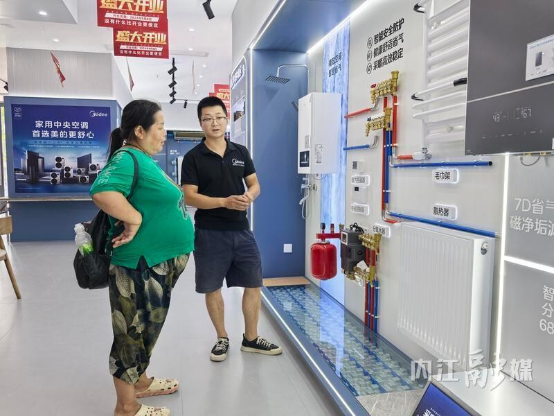 時間:2024-09-10 09:05:02 來源:內(nèi)江廣播電視臺“現(xiàn)在舊電器置換有沒有政策?”“有的,現(xiàn)在在搞以舊換新活動,部分電器除了有廠家補貼外,還可以立享政府補貼15%至20%?!?月7日,在東興區(qū)北環(huán)路西段美的中央空調(diào)智慧空氣館內(nèi),有市民正在咨詢了解購買電器相關(guān)優(yōu)惠政策。