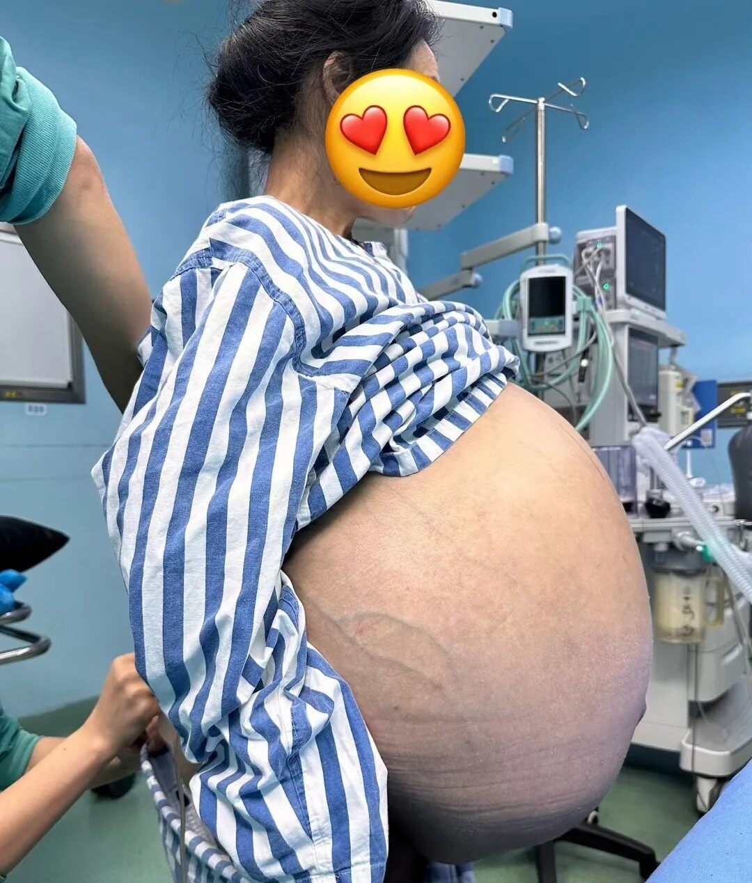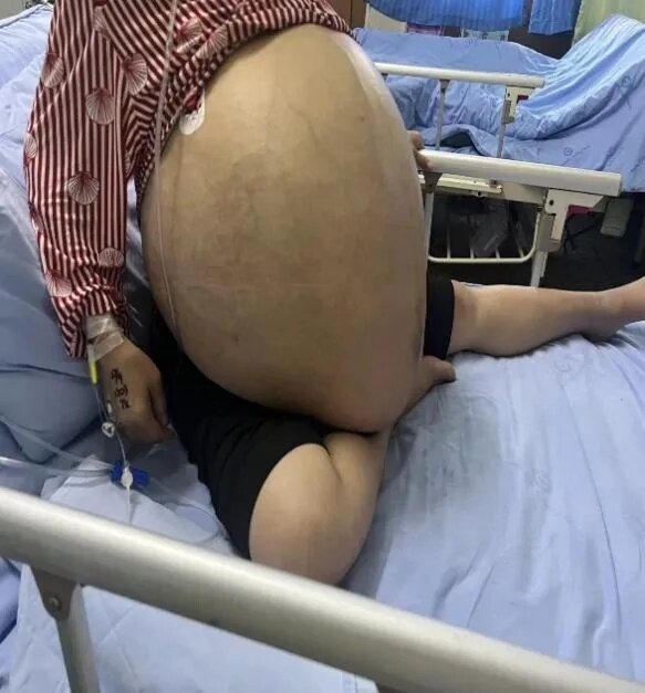 近日,我院肛腸胃腸外科(燒傷科)完成一例腹部巨大腫瘤切除手術(shù)。腫瘤包塊范圍40.3×31.7×43.2cm,重量約13斤,腹腔腫瘤及積液近80斤,約占體重的一半!