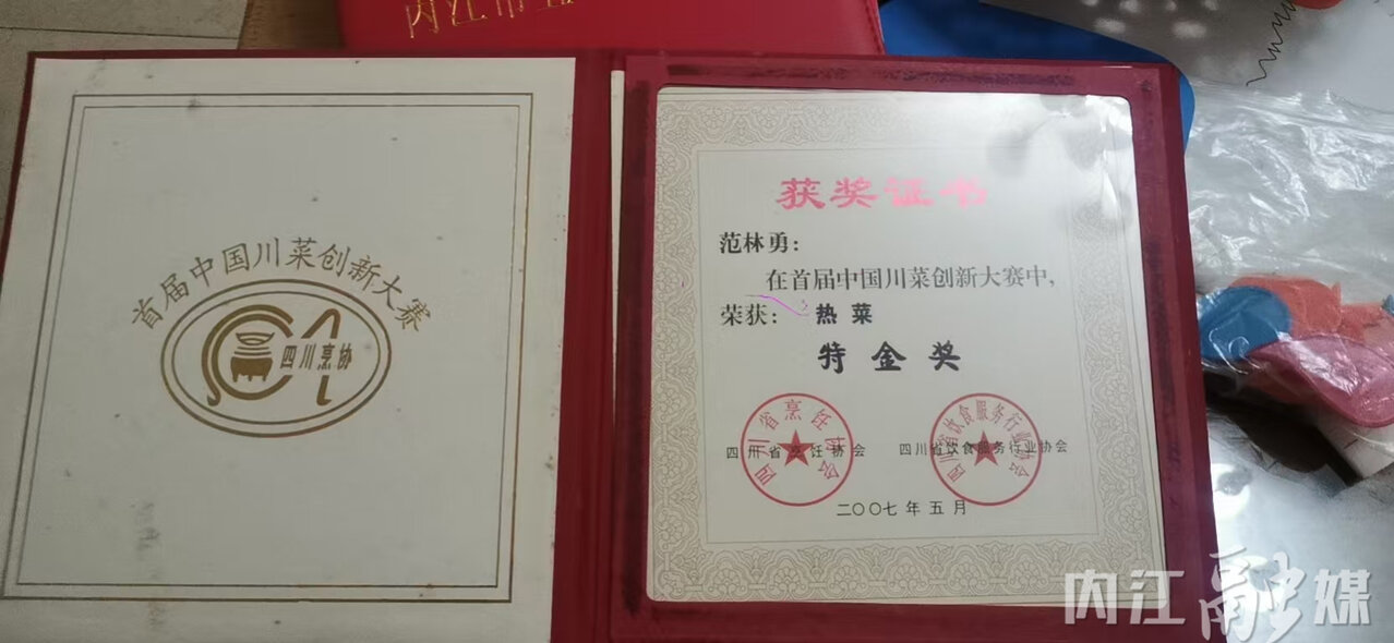 四方食事,不過一碗人間“煙火”。從業(yè)25年來,范林勇始終醉心于廚藝鉆研,專注于川菜的傳承和創(chuàng)新。2005年,他的創(chuàng)新菜品“玻璃耳片”入選內江十佳名菜,金毛獅子魚、蒜香排骨、酸辣開胃肘等特色菜受到大眾喜愛。同年他的創(chuàng)新菜品“團團圓圓”在四川省第三屆“碎米芽菜杯”烹飪大賽中獲得了金獎,并以此菜晉升為中式烹調師,參加了高級廚師研修班學習,考取了高級技師職稱,成為當時最年輕的高級技師;2007年他的創(chuàng)新菜品“清湯菊花豆腐”獲得中國首屆川菜創(chuàng)新大賽特金獎;2009年,他參加四川省第三屆農民工技能大賽獲得“二等獎”,并被授予“四川十大技能明星”稱號;2010年6月他還在“大千杯”四川第三屆川菜創(chuàng)新大賽中參加烹飪特技比賽獲“特技證書”。