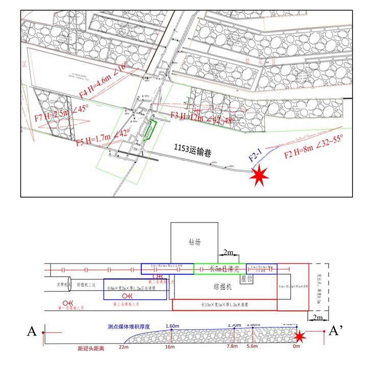 鎮(zhèn)雄縣平頂山煤業(yè)有限公司“6·7” 較大煤與瓦斯突出事故示意圖◆ 2024年6月7日零點(diǎn)班(6月6日23時(shí)至6月7日7時(shí)),當(dāng)班出勤72人(其中有38人未攜帶標(biāo)識卡),帶班礦領(lǐng)導(dǎo)為通防副總工程師張某義。◆ 6月6日22時(shí)40分,張某義召開會議布置當(dāng)班工作,其中安排掘進(jìn)隊(duì)到1153運(yùn)輸巷掘進(jìn)工作面施工錨桿錨索、清理浮煤,并安排打鉆隊(duì)在巷道中部施工順層瓦斯抽采鉆孔。23時(shí),張某義帶領(lǐng)安全員蔣某軍等人率先入井。◆ 6月6日23時(shí),掘進(jìn)隊(duì)副隊(duì)長張某明組織開掘進(jìn)隊(duì)班前會,安排李某金(班長,遇難者一)、郭某均(遇難者二)、張某(遇難者三)、龍某平、李某田、付某朝、楊某兵7人到1153運(yùn)輸巷掘進(jìn)工作面支護(hù)、清理浮煤。6月7日0時(shí)5分,李某金等7人入井作 業(yè)。◆ 6月7日0時(shí)10分,張某義帶、蔣某軍到達(dá)1153運(yùn)輸巷掘進(jìn)工作面,2人發(fā)現(xiàn)煤體松軟,用便攜式甲烷傳感器檢查瓦斯?jié)舛?,煤壁瓦斯?jié)舛仍?.7%至0.9%之間。0時(shí)30分,李某金等7人到達(dá)1153運(yùn)輸巷掘進(jìn)工作面,張某義要求當(dāng)班不能掘進(jìn),安排當(dāng)班作業(yè)人員打錨索、錨桿支護(hù)頂板,清理底板浮煤,并要求綜掘機(jī)司機(jī)要把綜掘機(jī)后退到外面鉆場的位置。張某義布置完工作后離開,李某金、郭某均、張某、龍某平4人分兩組進(jìn)行錨索錨桿施工作業(yè),李某田、付某朝和楊某兵做輔助工作,安全員蔣某軍和瓦檢員劉某春在現(xiàn)場監(jiān)督。◆ 2時(shí)30分,劉某春離開迎頭到巷道中部填寫瓦斯檢查牌板。4時(shí)20分,施工完5根錨索、2根錨桿后,李某金安排楊某兵、李某田和付某朝3人去開皮帶,其中楊某兵負(fù)責(zé)開第一部皮帶,李某田、付某朝負(fù)責(zé)風(fēng)門外面的兩部皮帶;李某金、郭某均、張某、龍某平4人在迎頭作業(yè),其中張某負(fù)責(zé)開綜掘機(jī)清煤,李某金和郭維軍在皮帶機(jī)尾清理浮煤,龍某平負(fù)責(zé)整理電纜。此時(shí),安全員蔣某軍到1153運(yùn)輸巷距迎頭170m處監(jiān)督鉆場施工。4時(shí)50分,蔣某軍、劉某春、楊某兵等人就聽到“砰”的一聲響,伴有沖擊波,事故發(fā)生。