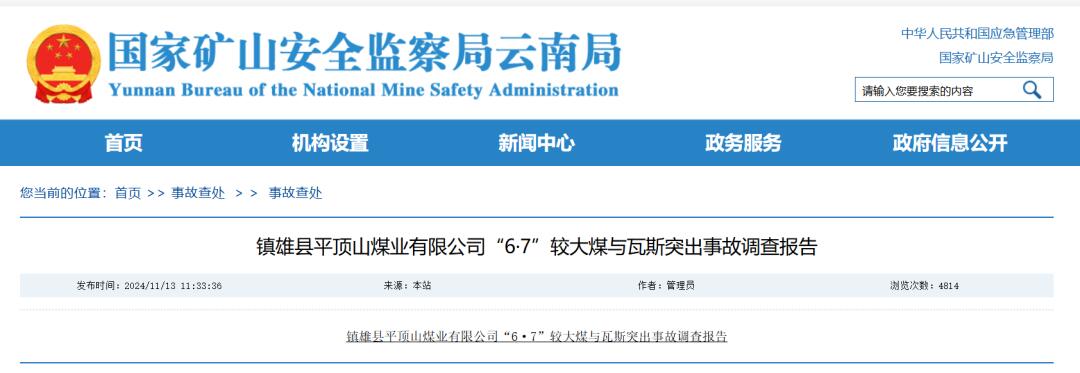 《鎮(zhèn)雄縣平頂山煤業(yè)有限公司“6·7”較大煤與瓦斯突出事故調(diào)查報(bào)告》