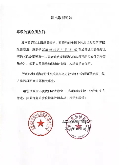 原定于2021年10月29日—30日于城市音樂廳歌劇廳演出的話劇《盜墓筆記IV:蛇沼鬼城》成都站、2021年10月31日于城市音樂廳演出的《你是鋼琴家—古典音樂啟蒙鋼琴名曲歡樂互動(dòng)多媒體親子音樂會(huì)》取消!延期演出日期將另行通知。