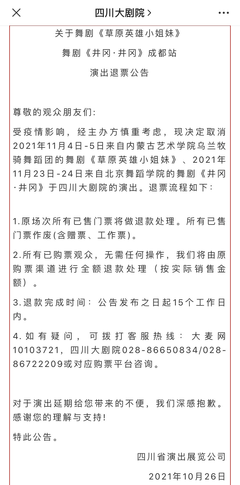 原定于2021年11月4日-5日來自內(nèi)蒙古藝術(shù)學(xué)院烏蘭牧騎舞蹈團(tuán)的舞劇《草原英雄小姐妹》、2021年11月23日-24日來自北京舞蹈學(xué)院的舞劇《井岡·井岡》于四川大劇院的演出取消!