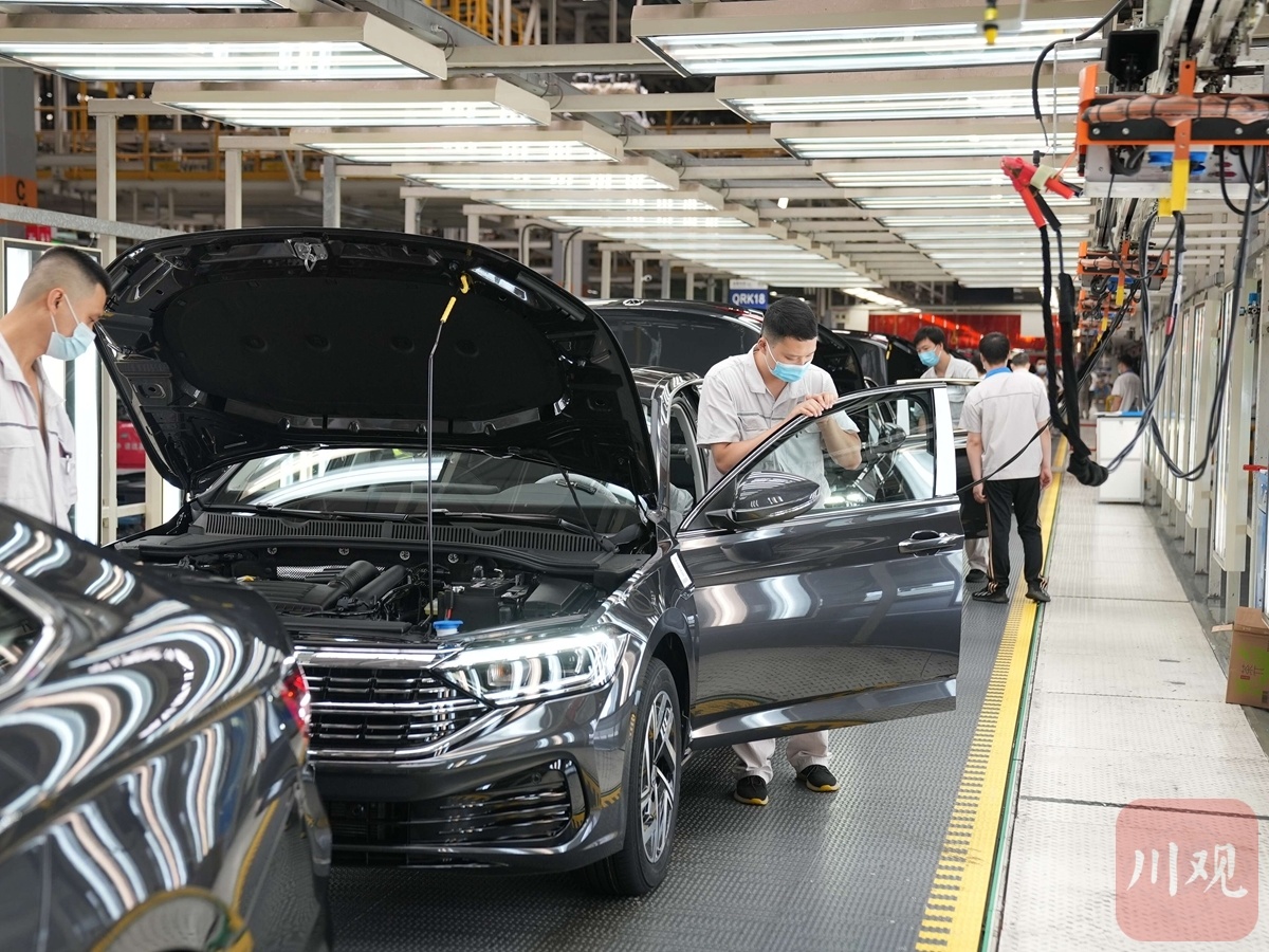 6月20日,成都經(jīng)開區(qū)一汽-大眾成都分公司總裝車間,生產(chǎn)線全部開啟,機(jī)械臂忙碌揮舞,運(yùn)送零部件的AGV小車來(lái)往穿梭。一輛輛即將在月底投入市場(chǎng)的新車排著隊(duì)駛下生產(chǎn)線。