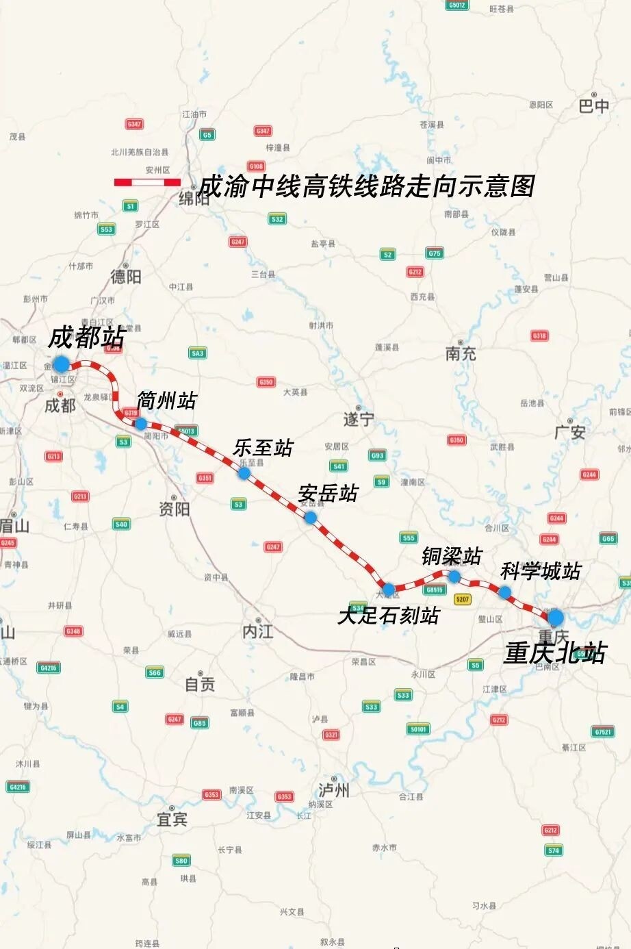 成渝中線高鐵是我國(guó)“八縱八橫”高鐵網(wǎng)沿江通道的重要組成部分,成渝中線高鐵自重慶樞紐重慶北站起,向西經(jīng)重慶市渝北區(qū)、沙坪壩區(qū)、璧山區(qū)、銅梁區(qū)、大足區(qū),四川省資陽市、成都市,引入成都樞紐成都站,正線全長(zhǎng)292公里,設(shè)計(jì)時(shí)速350公里。