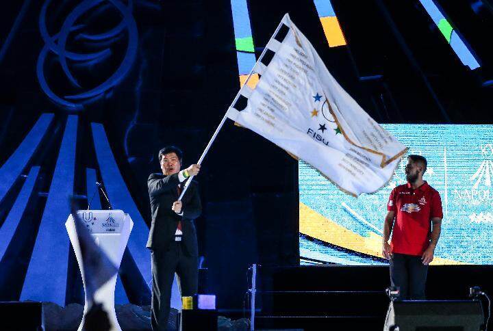 2019年7月14日,在意大利那不勒斯的第30屆世界大學(xué)生夏季運(yùn)動(dòng)閉幕式上,時(shí)任成都市市長羅強(qiáng)代表下屆世界大學(xué)生夏季運(yùn)動(dòng)會(huì)舉辦城市揮舞國際大學(xué)生體育聯(lián)合會(huì)會(huì)旗。新華社記者 鄭煥松 攝