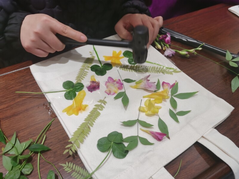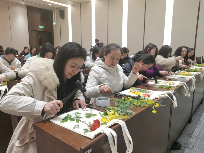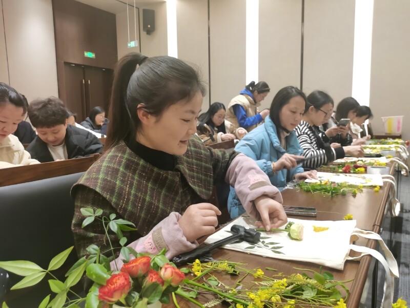 隨后,在專業(yè)老師的指導(dǎo)示范下,婦女同胞們迎來了充滿趣味的DIY植物拓染帆布包手工制作環(huán)節(jié)。大家充分利用現(xiàn)有的工具和花草枝葉,精心打磨,用心創(chuàng)作著一幅幅獨具匠心的拓染作品,活動現(xiàn)場氛圍濃厚,大家在歡聲笑語中充分展現(xiàn)出新時代女性剛?cè)岵慕韼斤L(fēng)采。