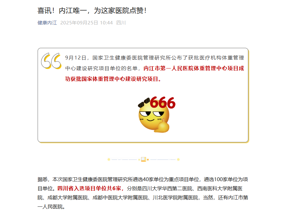 9月12日,國家衛(wèi)生健康委醫(yī)院管理研究所公布了獲批醫(yī)療機(jī)構(gòu)體重管理中心建設(shè)研究項(xiàng)目單位的名單,內(nèi)江市第一人民醫(yī)院體重管理中心項(xiàng)目成功獲批國家體重管理中..
